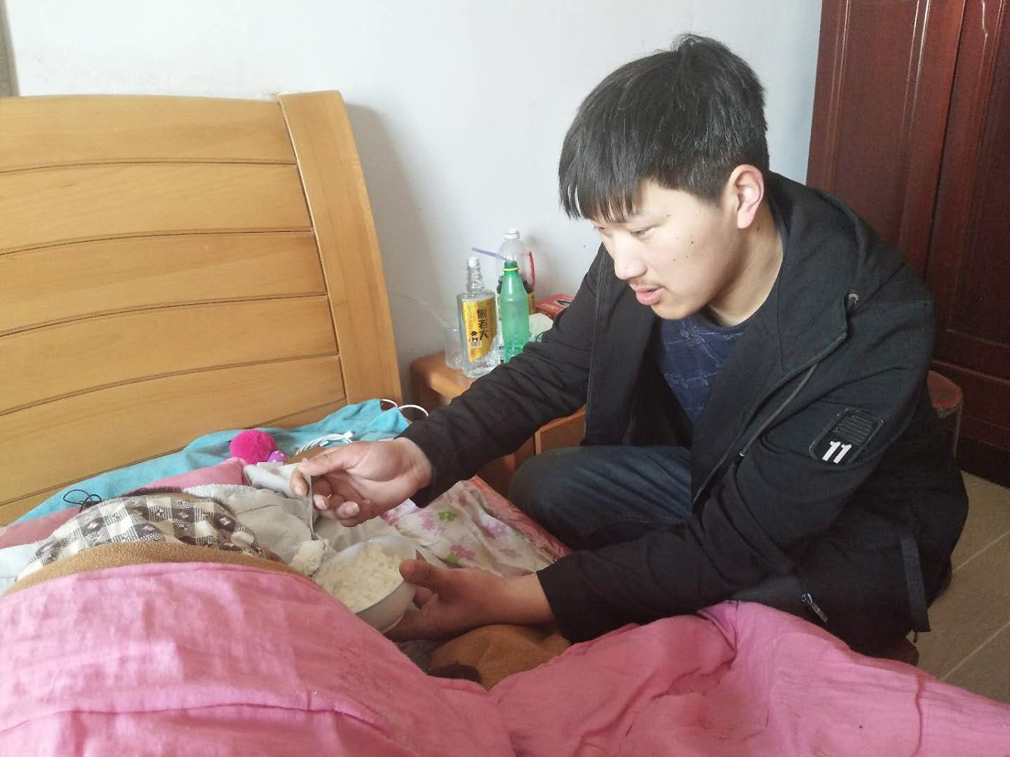 徐士堯是東辛農(nóng)場西洋社區(qū)居委會居民,他自幼聰明伶俐、勤奮好學、成績優(yōu)秀,和許多同齡的孩子一樣,他原本有個幸福的家庭,誰知命運多舛,在他上小學五年級的時候母親因意外事故去逝,2015年在他16歲讀高一的時候,厄運再次降臨,父親又因車禍導(dǎo)致高位截癱,臥床不起,生活不能自理,家里還有年邁多病80多歲的爺爺和奶奶,妹妹又正在讀小學,從此家里失去了頂梁柱,失去了經(jīng)濟來源,又增添了一位需要照顧的常年臥床病人,這樣小小的年紀,徐士堯過早嘗到了生活的艱辛,面對家庭的不幸,生活的挫折,他沒有退縮,只有堅韌,毅然決然地用稚嫩肩膀挑起了家庭生活的重擔,含淚放棄了自己的未竟學業(yè),放棄了自己的大學夢想,放棄了自己的錦秀前程,回到家中悉心照顧癱瘓的父親,端屎端尿、喂飯喂藥、翻身擦背……徐士堯無微不至地照顧著父親,每天從早到晚不厭其煩,不怕臟不怕累,同時在網(wǎng)上開店創(chuàng)業(yè)補貼家用,重新點燃了這個不幸家庭生活的希望。