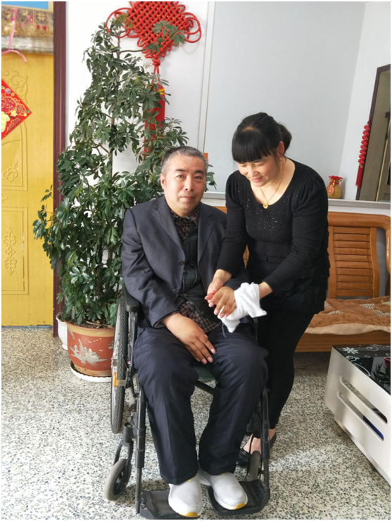 2003年1月2日早晨,一場意外的到來徹底打碎了苗新平平靜祥和的生活,丈夫王慶中在東灘工區(qū)爬電線桿進(jìn)行電工作業(yè)時(shí),不慎從高處跌落,導(dǎo)致頸椎嚴(yán)重摔傷,突如其來的打擊猶如晴天霹靂,經(jīng)過一個(gè)多月的搶救,丈夫的性命總算保住了,卻落下了四肢癱瘓后遺癥,日常起居只能靠坐輪椅。經(jīng)殘疾鑒定,王慶中為肢體殘疾一級(jí)。為了專心照顧丈夫,苗新平辭去了工作,給丈夫治病家里的積蓄很快都花完了,還欠了一屁股的債。盡管內(nèi)心忍受著巨大的煎熬,但她每天還是面帶微笑開導(dǎo)、安慰丈夫,哄他開心。癱瘓?jiān)诖驳恼煞蛏畈荒茏岳恚赀~體弱的公婆也需要有人照顧,這讓苗新平憧憬的幸福夢變得支離破碎。然而,生活中的不幸并沒有壓垮苗新平,反而讓她更加堅(jiān)強(qiáng)地面對生活,重新?lián)P起生活的風(fēng)帆。從此,當(dāng)別人早已進(jìn)入夢鄉(xiāng)的時(shí)候,苗新平還在忙著收拾家務(wù);當(dāng)別人睡眼朦朧地醒來,苗新平早已為家人準(zhǔn)備好了飯菜。由于丈夫長期癱瘓?jiān)诖玻笮”闶Ы钌贤耆荒茏岳恚浑x不棄,不厭其煩,精心侍候,每天總是按時(shí)為丈夫擦背按摩、端屎端尿、喂飯喂藥、翻身擦洗,為了減輕丈夫的病痛、消除心理壓力,天氣好的時(shí)候,苗新平還經(jīng)常推著坐在輪椅上的丈夫到公園或周邊轉(zhuǎn)轉(zhuǎn),夫妻兩人溫馨默契。十五年來,在苗新平的精心照顧下,丈夫全身沒起過褥瘡,沒生過痱子,沒摔過跤,還慢慢地長胖了。