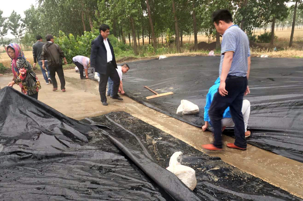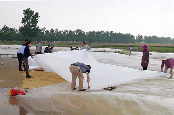 “雨中搶場”,雨急風(fēng)大,大家推糧的推糧,蓋雨布的蓋雨布,壓邊的壓邊,全然不顧場上細(xì)雨紛紛,塵土飛揚(yáng),緊張而有序地跟“老天爺”搶時(shí)間、比速度。據(jù)悉,經(jīng)過廣大干群近40分鐘的共同努力,緊急搶場,所有場面夏糧均安全進(jìn)入了雨布之下……。