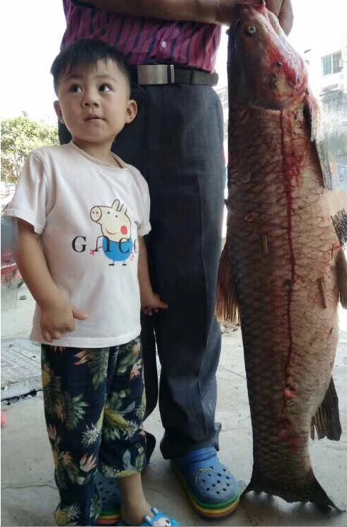 聽說袁幕輝釣了一條30多斤重的大魚,附近一位飯店老板找過來,向袁幕輝出1000元,欲將大青魚買下來,被袁幕輝婉言謝絕:“你出再高的價錢我也不會賣的。因為這條魚是從公共河道中釣上來的,我還得將它分給大家吃。”說完,袁幕輝從家里拿來菜刀,將魚鱗?了,將魚肚剖開來,掏出內臟,扣干凈魚腮,將魚洗干凈后,剁成十幾塊,然后分送給農場的鰥寡孤獨老人與左鄰右舍品嘗。圖1:魚拎起來,魚頭超過袁幕輝的腰眼。圖2:喲,好大的魚啊,我還沒它高呢!圖3:5個魚鱗排在一起近21厘米。