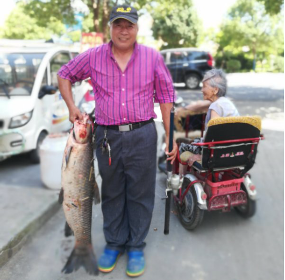 圍觀的人請袁幕輝將魚拎起來,看看有多長?袁幕輝將魚拎起來,魚頭超過了他的腰眼;袁幕輝的孫子金小貝看到爺爺釣到一條大魚,高興地圍著爺爺轉來轉去:“喲,這么大的魚!比我還高喱。”。幫助袁幕輝將魚從水里弄上來的辛師傅,拎著大青魚到附近菜市場的磅秤上稱一下,即使大青魚半截尾巴拖在地上,魚頭還超過了他的腰眼。他稱了一下,這條大青魚正好35斤。