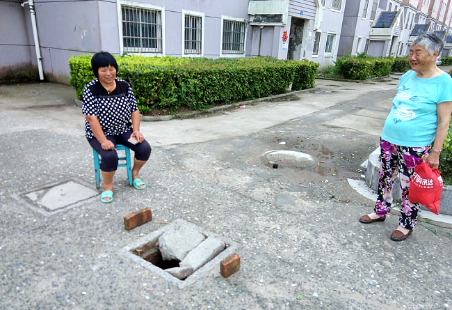 昨天,家住射陽縣淮海農場淮海路19號樓門面房中的農場居民賈長梅,傍晚發現樓道口間交通要道上的窨井蓋不知何時被過往的車輛壓壞了,知道這是安全隱患的的她,連忙拿來兩塊磚頭放在前后位置,又覺得不妥,就搬來了凳子,一邊坐在旁邊看護,一邊叫人聯系社區管理人員前來修復。