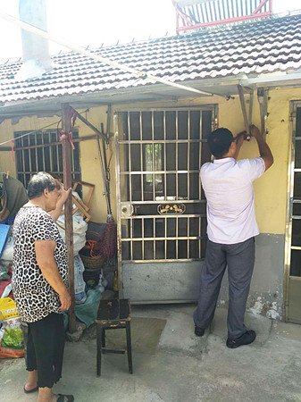 7月28日早上9點,在新洋農場有限公司城中居委會農業中心小區王奶奶家門前,城中居委會工作人員陸齊福正拿著錘子,給老人家固定門前的擋雨棚,室外溫度高達32度,汗水順著他的額頭一勁兒往下淌,他卻顧不上去擦。這是該公司關愛孤寡老人的表現一隅。