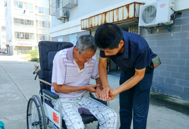 53歲的陳國軍原是淮海四分場(chǎng)社區(qū)農(nóng)機(jī)站的機(jī)駕人員,2004年秋季,因突發(fā)心臟病及血管方面的毛病,他在醫(yī)院里躺了一個(gè)多月才病愈;2006年,他病情復(fù)發(fā),搶救了16小時(shí)才醒了過來,從此不能從事重體力工作,每年要耗費(fèi)一筆不菲醫(yī)藥費(fèi)的他,被基層工會(huì)定為單位的建檔立卡貧困戶。不囿于貧困生活的他,自2005年開始,除期間到蘇州當(dāng)了一年半的超市保安外,其余的時(shí)間都是上門給行動(dòng)不便的老人做保姆,到目前為止,經(jīng)他服侍的老人已有22位,他在解決其他老年人頤養(yǎng)天年心愿的同時(shí),從而也讓他自己過上了一個(gè)靠自身勞動(dòng)獲得有尊嚴(yán)的生活。已經(jīng)有了經(jīng)濟(jì)來源的他,終于在去年摘掉了貧困戶的帽子,成為淮海走創(chuàng)業(yè)脫貧的典型。圖為陳國軍在為老人按摩、聊天時(shí)的鏡頭。