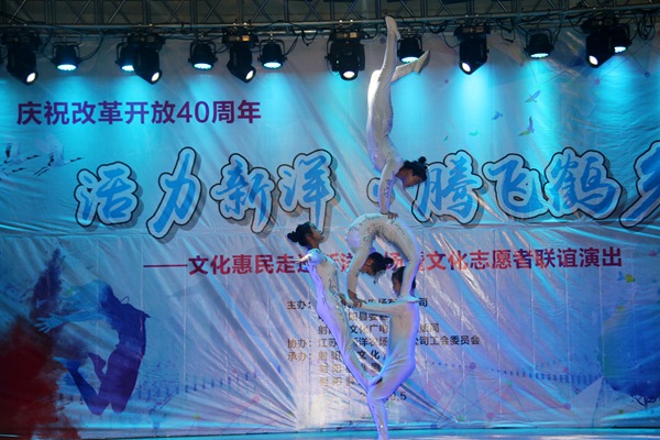 演出在開場舞《盛世歡歌》中拉開帷幕,女生獨唱《美麗的丹頂鶴》、舞蹈《吉祥》、雜技《肩上芭蕾》、魔術(shù)《千變?nèi)f化》等節(jié)目形式多樣、層次分明,一曲曲優(yōu)美的歌聲、一段段賞心悅目的舞蹈、一場場精彩絕倫的雜技表演……將現(xiàn)場氛圍漸漸推向高潮,最后,演出在舞蹈《美麗射陽》中落下帷幕。