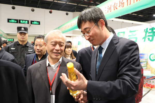 交易會開幕當日,江蘇省農(nóng)業(yè)農(nóng)村工作領(lǐng)導(dǎo)小組副組長胥愛貴等領(lǐng)導(dǎo)巡館來到江蘇農(nóng)墾展館,在集團公司企劃部負責人和朱明亮的陪同下,專程到臨海農(nóng)場公司展位調(diào)研指導(dǎo)。朱明亮向領(lǐng)導(dǎo)介紹,近年來農(nóng)場公司按照省委和集團公司黨委的統(tǒng)一部署,利用資源和組織化優(yōu)勢,推進企業(yè)高質(zhì)量發(fā)展,推動產(chǎn)業(yè)提檔升級,塑造生態(tài)健康農(nóng)副產(chǎn)品。可以生吃的健康油“綠農(nóng)園”牌牡丹籽油就是公司推出的優(yōu)質(zhì)精品之一。胥愛貴說,知道臨海農(nóng)場在射陽縣境內(nèi),對臨海農(nóng)場公司種植油用牡丹、發(fā)展牡丹籽油產(chǎn)業(yè)的情況有所了解。他指出,江蘇農(nóng)墾及臨海農(nóng)場公司要在推進現(xiàn)代農(nóng)業(yè)建設(shè)和推進質(zhì)量可追溯的健康農(nóng)副產(chǎn)品方面發(fā)揮示范引領(lǐng)作用;要通過交易會這個平臺,推出更多、更好的優(yōu)質(zhì)農(nóng)副產(chǎn)品給上海大眾,展示江蘇現(xiàn)代農(nóng)業(yè)發(fā)展的成就,讓上海各界人士更好地了解江蘇及品味江蘇優(yōu)質(zhì)農(nóng)產(chǎn)品。一同參加巡館的江蘇省糧食局夏春勝局長詳細詢問了“綠農(nóng)園”牌牡丹籽油的種植、生產(chǎn)、品牌開發(fā)及經(jīng)營銷售等情況。