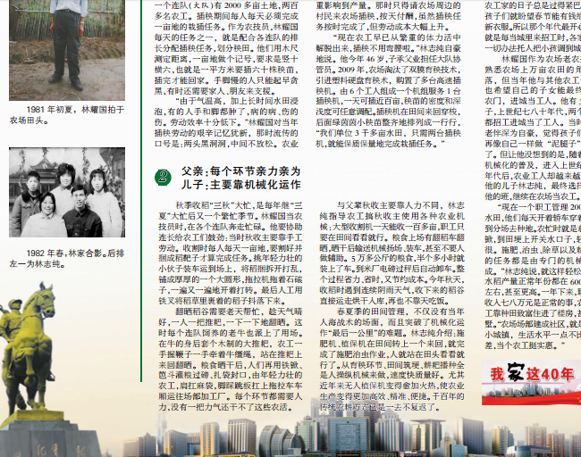 “現(xiàn)在一個(gè)職工管理200多畝水田,他們每天開著轎車穿著皮鞋到分場(chǎng)去種地。農(nóng)忙時(shí)就是拿著鐵锨,到田埂上開關(guān)水口子,輕松得很。施肥、治蟲、除草以及耕耙播的任務(wù)都是由專門的機(jī)械來(lái)完成。”林志純說,就這樣輕松上班,水稻產(chǎn)量正常年份都在600公斤左右,甚至更高。一年下來(lái),職工的收入七八萬(wàn)元是正常的事,農(nóng)場(chǎng)職工靠種田致富住進(jìn)了樓房,甚至別墅。“農(nóng)場(chǎng)場(chǎng)部建成社區(qū),就是一個(gè)小城鎮(zhèn),生活水平一點(diǎn)不比城里差,當(dāng)個(gè)農(nóng)工挺實(shí)惠。”圖為刊登《我家這40年》人物稿報(bào)紙和林耀國(guó)父子在插秧機(jī)上感受新型農(nóng)機(jī)時(shí)的鏡頭。