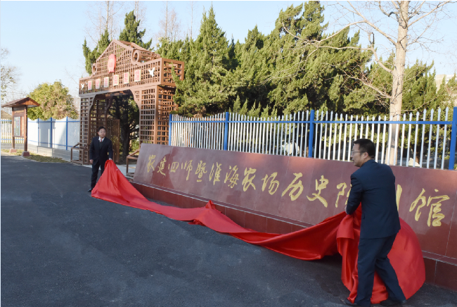 12月29日上午8點58分,農建四師暨淮海農場歷史陳列館二期工程舉行開館儀式,淮海農場有限公司黨委書記王進強致辭,紀委書記、工會主席孫國祥主持開館儀式。淮海領導班子全體成員,片區財務總監,離退休老干部代表,駐場單位主要負責人,各分場社區科級助理以上人員、干事,場直各單位負責人,機關及社區本部全體人員參加了開館儀式。