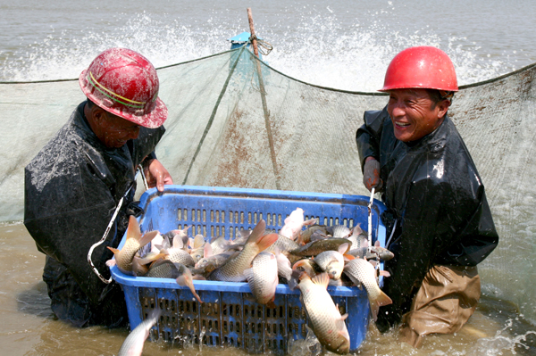 (圖為水產(chǎn)集體養(yǎng)殖場職工喜捕豐收魚)