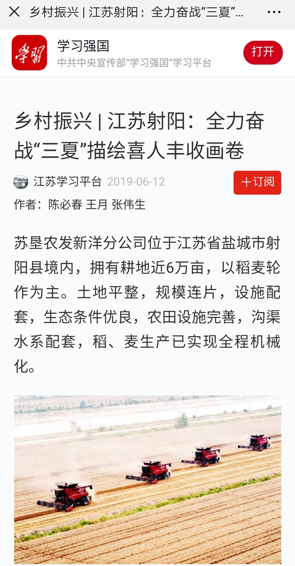 6月12日,《江蘇射陽:全力奮戰“三夏”描繪喜人豐收畫卷》一文被“學習強國”平臺鄉村振興欄目采用。這是新洋以“學習強國”為載體加強黨員學習教育的同時,積極利用該平臺展示新洋農業風采的一個縮影。
