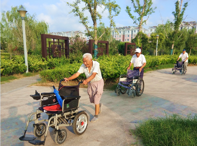 “我們每天坐在輪椅上來公園看看風景、聊聊天,生活也是很充實。當然了,推著輪椅車在公園里轉圈賽跑,也是我們自我加強體能鍛煉的一種活法,這樣的生活我們這些老頭都是感到很愜意。”三位老人一致地表述著。