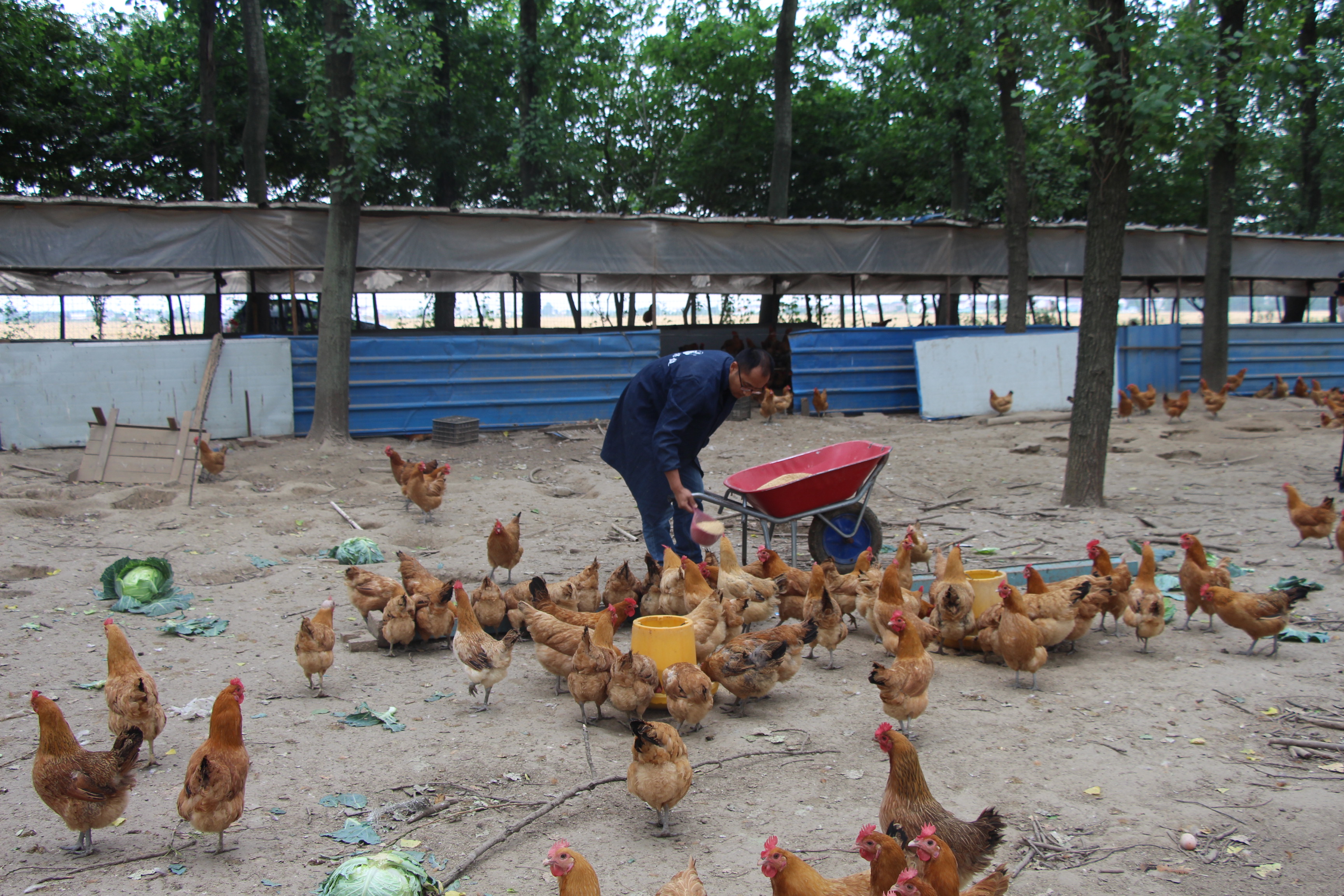 海安農場場部的南邊是農場三大隊,走進三大隊,一片樹林便映入眼簾,不遠處聽到連綿不斷的雞鳴聲,走近一看,原來是一個林下養雞場,雞場的主人是一位年僅36歲的年青人,他名叫田佳斌,來自如皋市江安鎮。