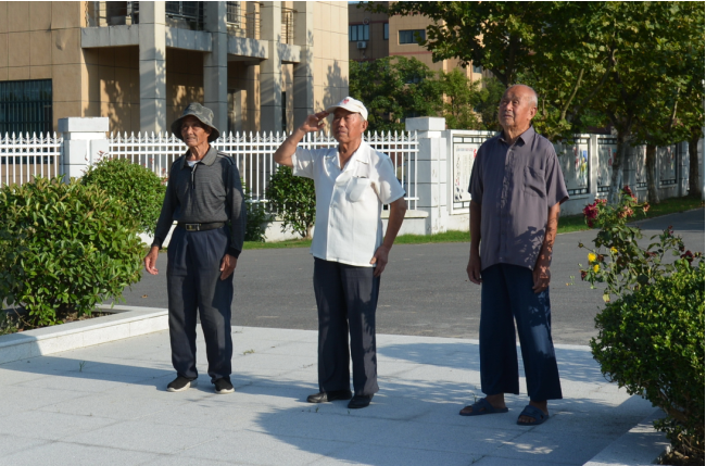 9月12日下午,謝開平、于明生、胡鐵成等三名屯墾戍邊的老人相約來到了農建四師暨淮海農場歷史陳列館,依次參觀了農建四師紀念碑、毛澤東主席命令碑文和農建四師陳列館,他們在參觀時相互攙扶著進行參觀敘說著曾經的過往。在農建四師紀念碑前,88歲謝開平老兵以立正姿態,莊嚴地舉起右手向農建四師紀念碑行軍禮良久。