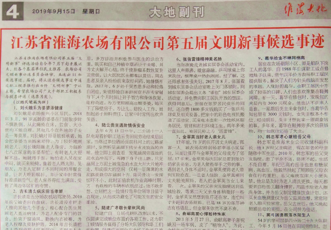 自2015年以來的五屆兩年一度淮海農場有限公司文明新事的組織搜尋工作,一方面為了把符合民意、感人至深“淮海好人”的文明新事舉薦出來,促進農場精神文明創建工作再上新臺階,淮海農場干部職工和當地居民積極通過多舉措,來開展淮海農場身邊好人線索的推薦工作,有力地擴大了“淮海好人”的影響力。另一方面大力宣傳和弘揚已經入選的農場公司文明新事典型,通過在廣場文化節上戴紅花、坐主席臺和登臺接受表彰的形式,進行傳播。同時還借助淮海大地報、櫥窗、網站、微信公眾號等形式,進行包裝宣傳,以期形成文明新事集成推出的轟動效應。