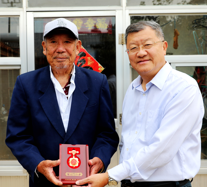 黃海農場公司黨委書記賀在銳到離休老干部涂建華、約田家中看望他們,向老同志致以節日問候,為他們佩戴上“慶祝中華人民共和國成立70周年”紀念章,由衷感謝他們在不同歷史時期為黨和人民,為黃海經濟社會發展作出的貢獻,并與他們親切交談,詳細了解老同志的生活起居和健康情況,囑咐老人要保重身體,祝福老人健康長壽。