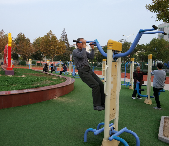 在淮海農場職工休閑體育運動廣場的健身器材上,一位頭發花白的老人雙手拉著雙杠,頭朝下腿朝上,雙腿緩慢上抬,直到伸直為止,一個固定的動作能撐上幾分鐘。該老人名叫周少彪,今年88歲,他是江蘇射陽縣淮海農場社區城南居委會的居民,這是筆者看到的情景。不僅如此,已經88歲高齡的他,還就地撐上十幾個仰臥撐、在塑膠跑道上進行雙腿交叉跑等高難度動作,其身體的柔軟程度令人驚嘆。