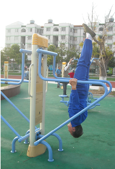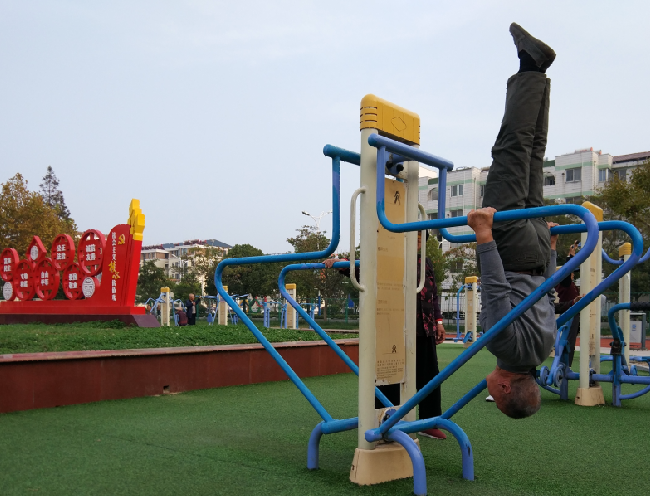 淮海農場職工休閑體育運動廣場的健身器材上,一位頭發花白的老人雙手拉著雙杠,頭朝下腿朝上,雙腿緩慢上抬,直到伸直為止,一個固定的動作能撐上幾分鐘。該老人名叫周少彪,今年88歲,他是江蘇射陽縣淮海農場社區城南居委會的居民,這是筆者看到的情景。不僅如此,已經88歲高齡的他就地撐上十幾個仰臥撐在塑膠跑道上進行雙腿交叉跑等高難度動作,身體柔軟程度令人驚嘆。