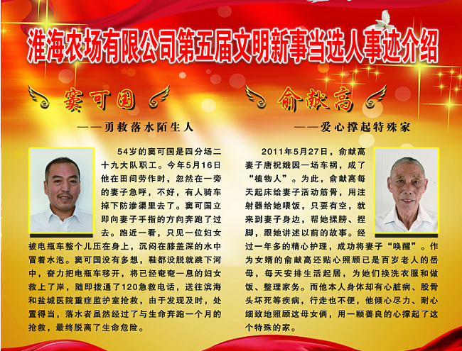 走進淮海農場有限公司機關大門,西側櫥窗上6名文明新事的先進典型赫然在目,細讀帶有他們頭像標志的文明新事事跡,讓人不僅產生了發自內心的感動。自今年第五屆文明新事在農場公司的第十三屆廣場文化節上表彰以來,做文明人,踐文明事,已經成為了農場公司職工居民的新追求。而舉薦和表彰文明新事活動,既是農場公司開展“不忘初心、牢記使命”主題教育的一項重要內容,也是全淮海上下學習先鋒先進、激發使命擔當的一項重要舉措。