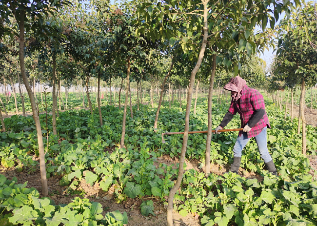 淮海農場境內有面積較大的林地面積,并且苗木長勢較好,成為農場生態林地發展的一景。林木的發展,利益于農場采取的集體林、股份林和承租林三種管理模式,因股份林和承租林一般由職工管理的林下經濟發展的較好外,昨天下午,我們來到農場五分場社區集體管護的林地間看到,其林下林邊的油菜、蠶豆等矮桿農作物長勢正旺,農業職工正在林下進行鋤草等農事活動,給這個新春增添了一道忙碌的風景。