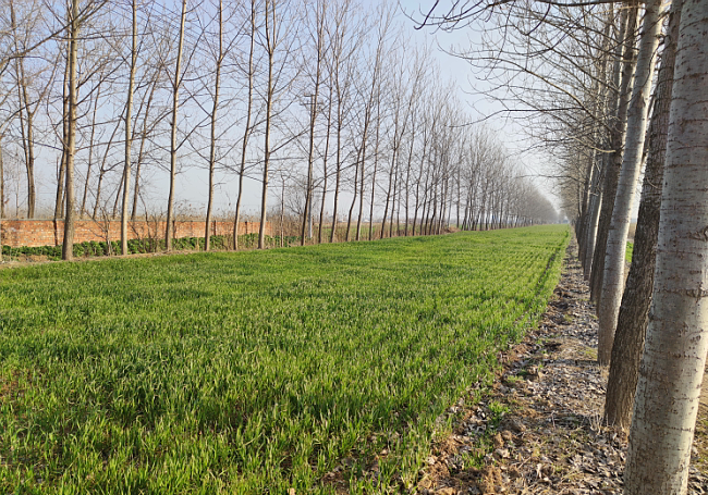 走在江蘇農(nóng)墾淮海農(nóng)場廣袤的田野上,我們看到許多鑲嵌在田間林網(wǎng)化的林下,一片片不輸于大田作物的綠色十分惹眼,踏進(jìn)一條條林地間,一棵棵粗壯的小麥苗連成一片,在狹窄的林地間一路遠(yuǎn)去,成就了農(nóng)場許多林管人員的增收致富夢(mèng)想———
