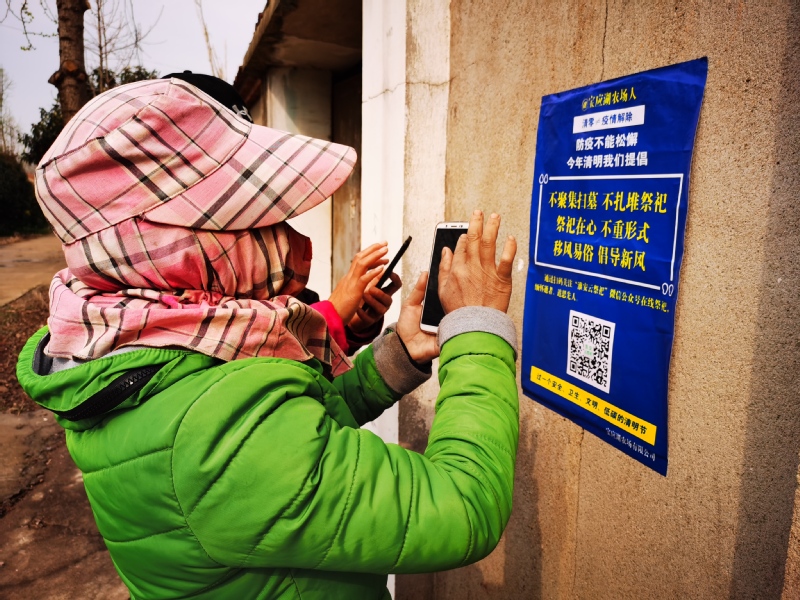 農場公司黨委工作部將通告精神錄制成音頻、編制成視頻,在廣播、電視、網站等進行宣傳,又制作宣傳掛圖50張、展牌4塊,出動流動喇叭17只在街道、集鎮、居民點進行巡回宣講,還組織文明志愿者、黨員青年,深入社區、居民點,指導職工居民通過掃碼關注“淮安云祭祀”微信公眾號網上祭奠,使在線祭祀緬懷先人成為寶應湖人的新時尚。