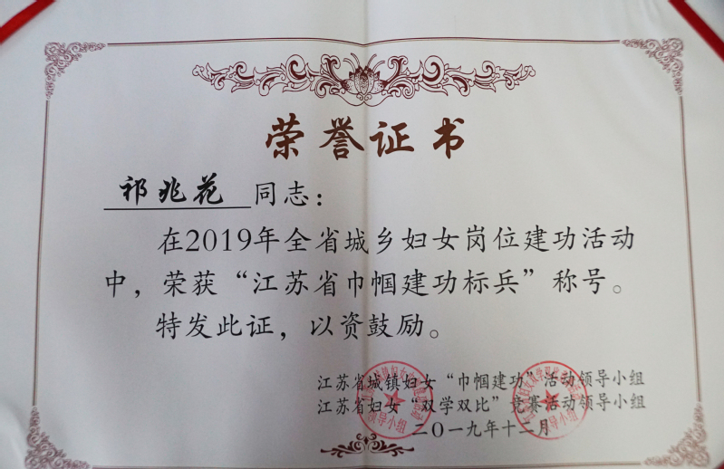 日前,從江蘇省婦聯(lián)獲悉,新洋農場有限公司職工祁兆花在2019年度全省城鄉(xiāng)婦女崗位建功活動中被授予“江蘇省巾幗建功標兵”榮譽稱號。此前,祁兆花分別獲得“鹽城市最美巾幗”、“射陽縣最美家庭”、“最美射陽人”等榮譽。