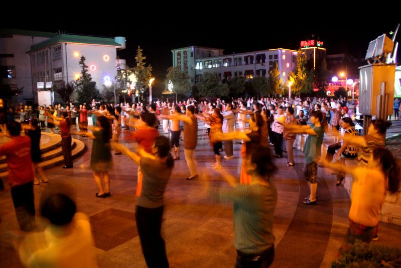 夜幕四合,新洋農(nóng)場場部中心的世紀廣場華燈齊放,吃過晚飯的人們不斷向廣場匯聚,一開始,早到的人三五成群,或聊天,或做些簡單的運動。人越聚越多,7點整,優(yōu)雅的音樂聲驟然響起,猶如號令一般,四處閑散的人自覺主動的站起了隊,排成了行,在前方領(lǐng)舞者引領(lǐng)下,隨著音樂的節(jié)奏,跳起了佳木斯快樂舞步健身操。站在高處,俯瞰整個廣場,偌大的廣場足足有三五百人,有男有女,有老有少,下至20多歲的少男少女,上至七八十歲的耄耋老人,節(jié)奏明朗,舞步歡快,整個廣場激情四射,成了歡樂的海洋。