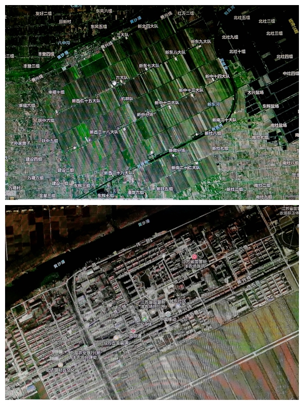 圖為北斗上拍攝的新洋農場全圖和新洋小鎮(zhèn)全圖