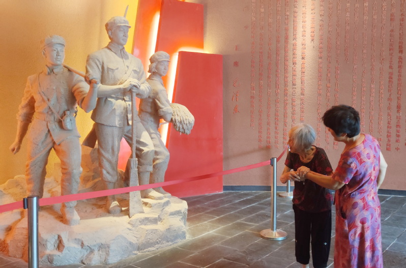 “哎喲喂,這幾個人真大。”一走進農建四師陳列館中,張瑞瑞老人就對大廳內的三位雕像產生了濃厚的興趣,拽著女兒來到雕像前仔細地觀看著。據悉,這也是百歲老人第一次走進陳列館中,看得到她對里邊的裝飾特別是人物雕像很感興趣。