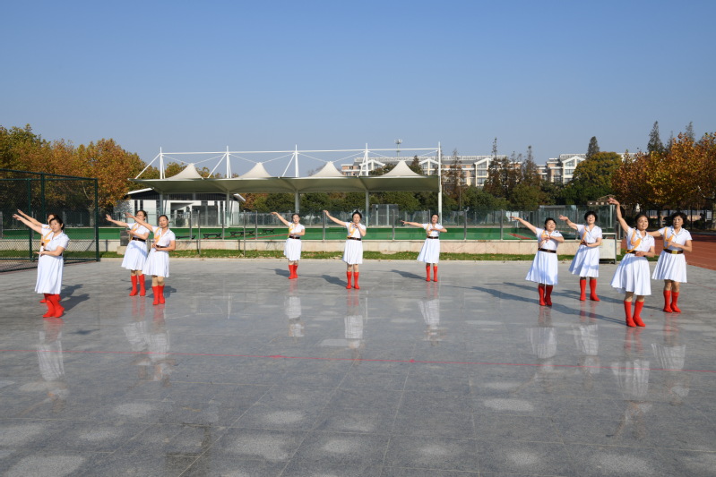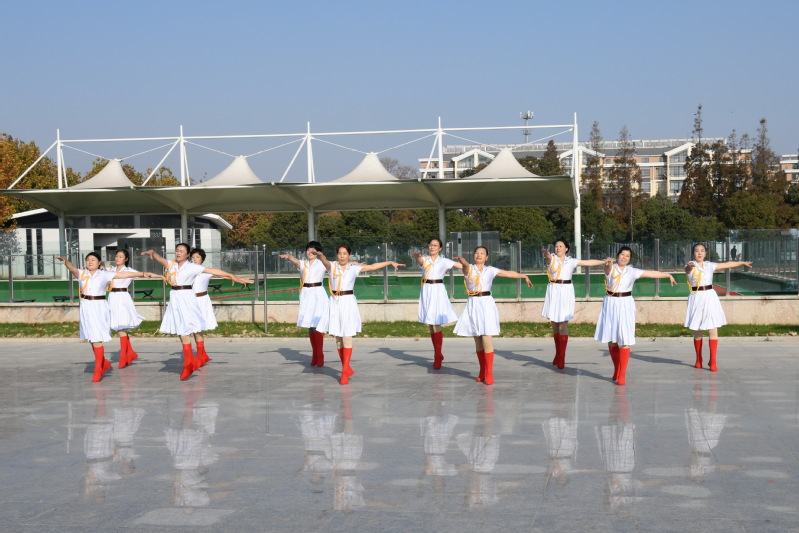 走進淮海職工休閑體育運動廣場中偌大的舞蹈池中,只見十多位穿著盛裝的大媽級的舞蹈愛好者們,正在一遍又一遍地排練著節目,他們不厭其煩地協調著舞姿、規范著動作,從他們認真的神態和一絲不茍的敬業精神中,讓我們感受到現場上的這支文藝隊對節目排練的認真程度。表演隊員們一會兒隨著領頭人的節拍,穿插表演著難度較高舞蹈節目的動作,一會兒跟隨著歡快的節奏,跳轉著輕快的步伐。他們統一的服裝和整齊劃一的動作,立刻就引起旁邊觀看職工群眾的喝彩,也給他們帶來的莫大的視聽享受。