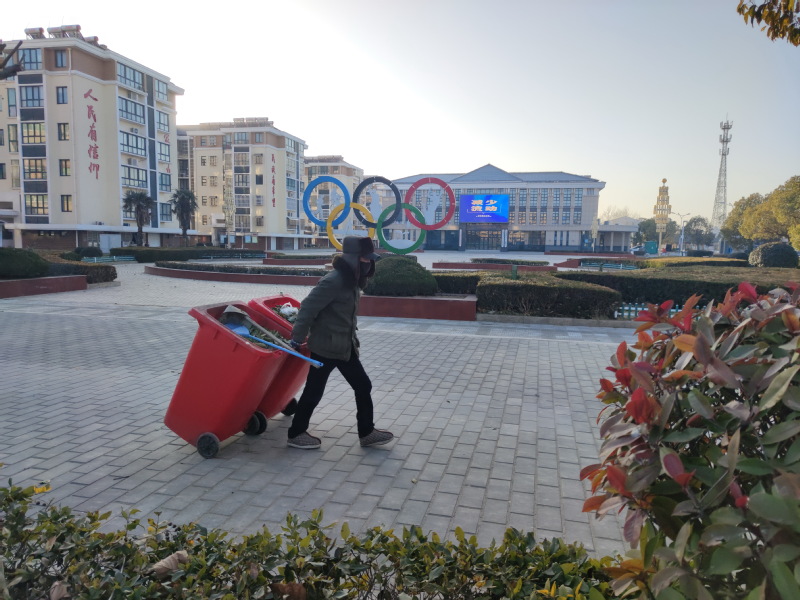 圖為一名環(huán)衛(wèi)職工正將清掃出來的樹葉運(yùn)走和清掃后農(nóng)場各條道路上清潔衛(wèi)生時的鏡頭。