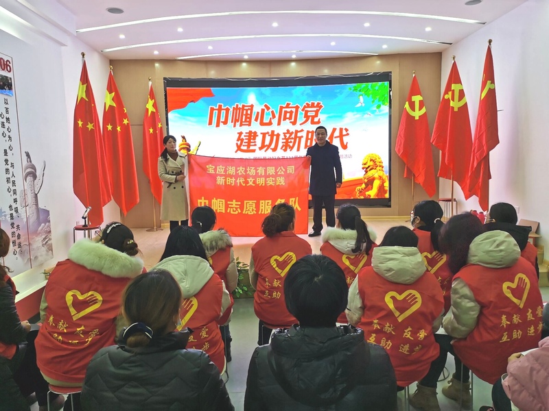 “我志愿成為一名光榮的巾幗志愿者……”3月6日,寶應湖農場公司新時代文明實踐所,42名婦女代表面對隊旗莊嚴宣誓,這是農場公司三八婦女節主題活動的一個場景。