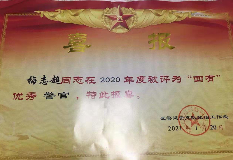 梅志超1995年7月出生,2013年9月考上4+1軍校,取得了雙學士學位,畢業(yè)后在中國人民武裝警察部隊延安支隊服役;通過開展送立功喜報活動,讓軍人、軍屬感到光榮,讓官兵感到溫暖,增強現(xiàn)役官兵的光榮感、自豪感和使命感,增強立功受獎家屬的榮譽感,營造愛黨愛國、尊崇軍人、關(guān)心國防的濃厚氛圍,樹立“參軍光榮”的良好社會風尚,發(fā)揮立功受獎的榜樣帶動作用,無形中激發(fā)廣大青年參軍報國、獻身國防的熱情,為全面實現(xiàn)“新時代強軍之夢”打下堅實基礎(chǔ)。