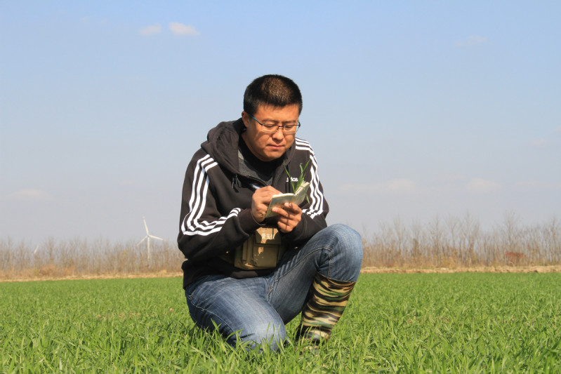 2012年,當(dāng)他信心百倍的投入到農(nóng)業(yè)生產(chǎn)中時,卻被現(xiàn)實(shí)潑了一盆冷水,原來病蟲防治沒那么容易,水肥運(yùn)籌也沒那么簡單,自認(rèn)為掌握扎實(shí)的專業(yè)知識,卻一時失去了用武之地。實(shí)踐與理論的差距讓他深深的意識到,紙上談兵是搞不好農(nóng)業(yè)的,必須將知識根植到實(shí)踐中,才能結(jié)出豐碩的果實(shí)。于是,拜師學(xué)藝、苦心研究成了他的生活重心。請有著20多年農(nóng)業(yè)生產(chǎn)經(jīng)驗(yàn)的生產(chǎn)區(qū)技術(shù)員做師傅,沉下心來,從頭學(xué)起。每天清晨,跑田調(diào)查、記錄,向師傅請教,直到搞懂弄通,晚上回家后,將當(dāng)天知識總結(jié)整理、記錄在冊,案頭厚厚一摞筆記本見證了他的努力和成長。“三人行,必有我?guī)煛?,只要能學(xué)到東西,無論是領(lǐng)導(dǎo)、同事還是工人,他都虛心請教,幾次都因?yàn)?/span>探討技術(shù)問題而忘了時間,漏接上托班的孩子;為了驗(yàn)證自己的想法,他反復(fù)進(jìn)行田間試驗(yàn);為確保數(shù)據(jù)準(zhǔn)確性,無論嚴(yán)寒酷暑,只要是試驗(yàn)需要,他都會按時調(diào)查,風(fēng)雨無阻。