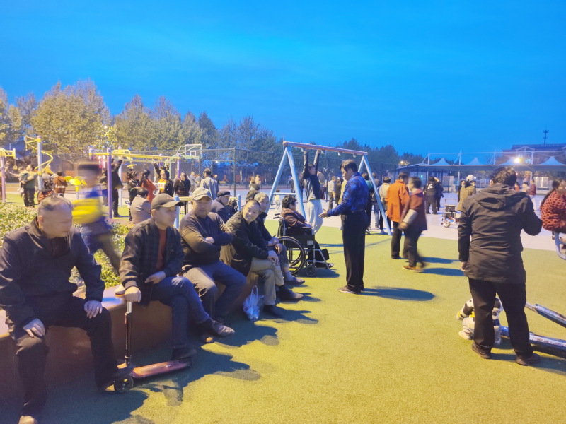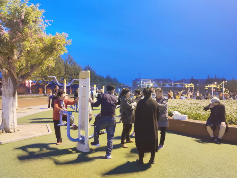 “淮海農(nóng)場職工居民休閑體育運動廣場,真是方便我們這些老年人早晚鍛煉,廣場就在農(nóng)場中心地帶抬腳就到,方便得很”。家住群樂小區(qū)的殷大爺十分激動地說。