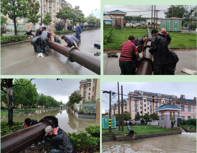 雖然此時小雨還在下,天上的云層還在翻滾,但有大家的齊心協力,居民們還是信心滿滿。最終水位也在大家的期盼下,漸漸褪去,農場又恢復了平靜。圖為農場社區的志愿服務小分隊在安裝臨時水泵時的鏡頭。