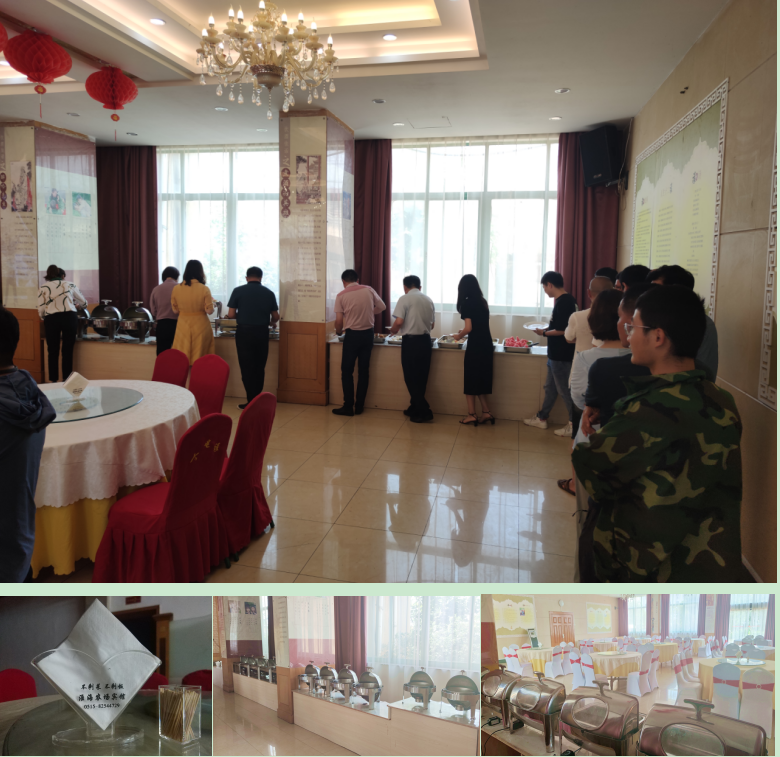 我們在淮海賓館的餐廳內(nèi)看到,一側(cè)的條桌上整齊地?cái)[放著各式各樣的菜肴,人們用餐時(shí)依次排隊(duì),通過拿盤拿筷,按要求拿起各個(gè)菜盤旁的夾勺等用具,拿取食物,然后裝滿自己需要吃的菜肴和一定份量的飯菜后,各自坐到廳內(nèi)的餐桌中用餐。每個(gè)餐桌上放置了“不剩菜 不剩飯”的溫馨提示標(biāo)牌,一方面是在時(shí)時(shí)提醒著大家取飯菜的份量,另一方面保證所取的飯菜全部吃光,以自律來踐行“光盤行動”。整個(gè)餐廳在淮海農(nóng)場風(fēng)光片中,回蕩著溫暖柔和的旋律。
