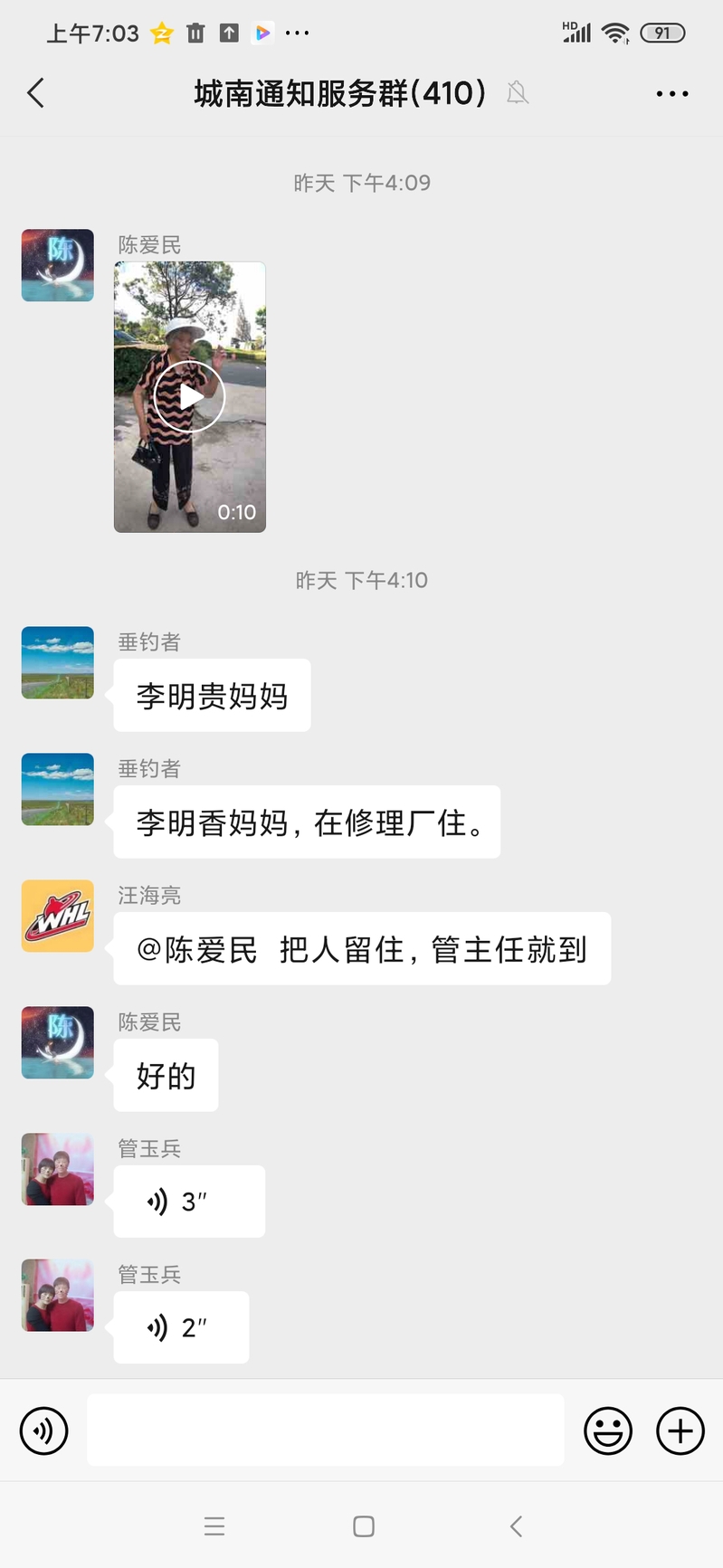 視頻剛一上傳,一名網名叫垂釣者的網友便立即回復,這是李某某的媽媽,在修理廠住。農場聯防隊員汪海亮則第一時間把發生的事情電話告訴城南居委會主任管玉兵,并隨即@報料人,請把人留住,城南社區管主任馬上就到。