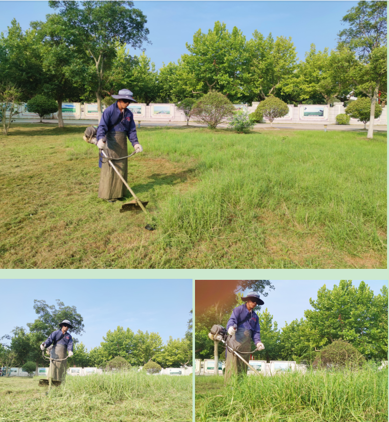 8月10日,立秋后第四天,雖然還是早上8點,但烈日炎炎下的戶外已經感受到了太陽的威力,正當人們在空調房享受涼爽之時,淮海農場社區綠化環衛所的員工們正冒著酷暑,在戶外揮汗如雨地進行著綠化草坪的修剪工作。