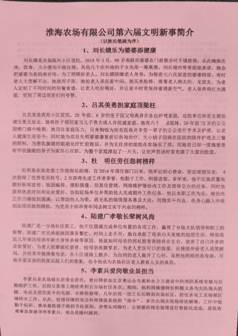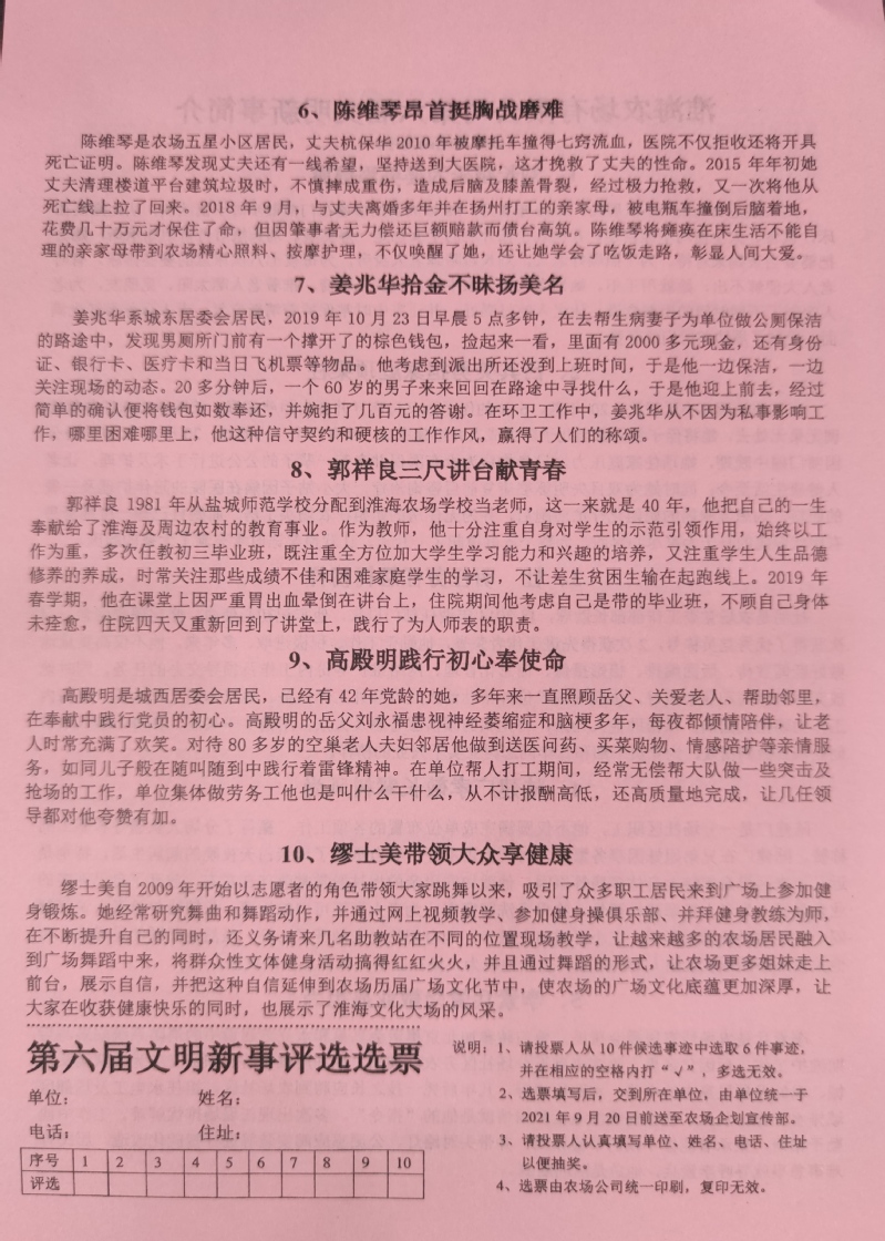 一批又一批文明新事,在淮海文明的土壤上層出不窮,那些見(jiàn)義勇為、孝老愛(ài)親、助人為樂(lè)、拾金不昧、敬業(yè)奉獻(xiàn)等文明新事宣傳,正與農(nóng)場(chǎng)軍墾傳統(tǒng)文化相融相合,并向全社會(huì)展示出“淮海好人”的最美故事和普通職工的別樣風(fēng)采。圖為淮海農(nóng)場(chǎng)有限公司發(fā)放的第六屆文明新事簡(jiǎn)介宣傳和填表單。