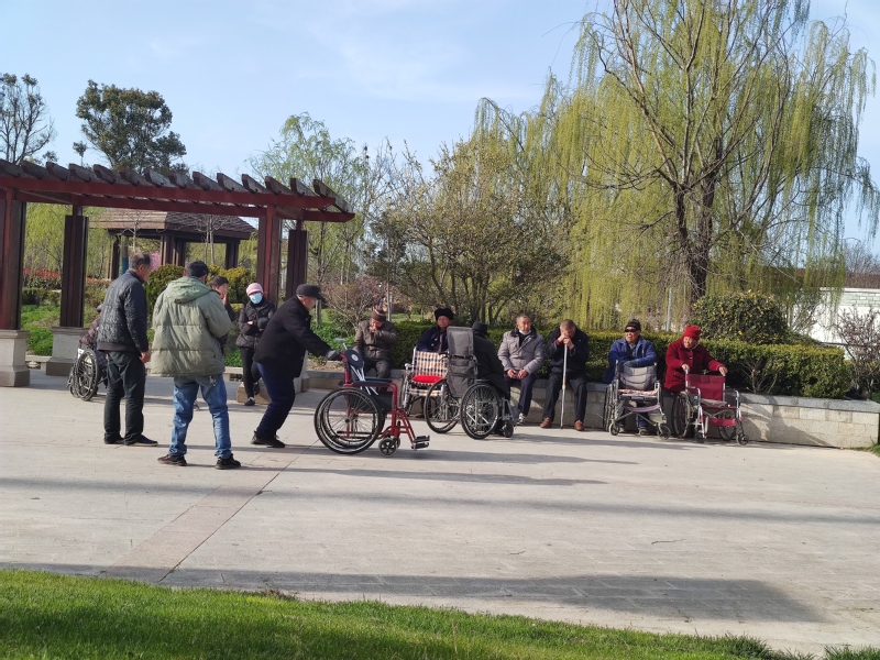 我們發(fā)現(xiàn),來這里休憩的老人中,推著輪椅來的老人特別的多,這些老人中,有自己轉(zhuǎn)著輪椅過來的,也有兒女推著他們過來的。“我爸總是讓我將他推到公園中來,他就喜歡與同齡人在一起熱鬧熱鬧,這樣他的心情才舒暢。”胡鐵成的兒子將老人推到公園坐椅著時(shí)對(duì)我說,“老人怎么說怎么好,我們做兒女的,滿足下他們的心愿就好了。圖為老人們在一起交談時(shí)的鏡頭。