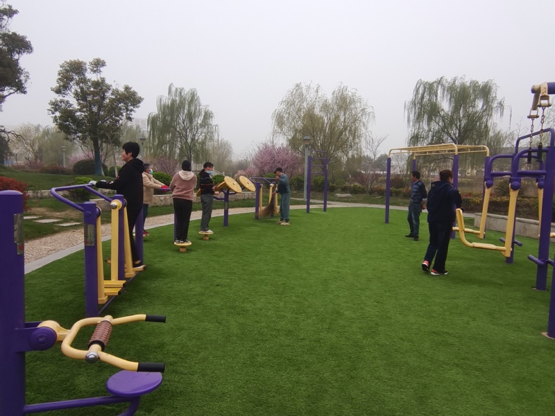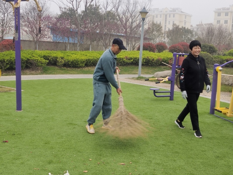 公園內的健身器材,是晨練人喜歡光顧的地方,大家來晨練時會先后來到公園運動器材處進行鍛煉。這里有一片綠色的塑料草坪,大大小小十多個運動器材,成為晨練人最好的健身之所。我幾次路過公園,都看見晨練人周家寶拿起大掃帚在運動器材等場地上打掃衛生,一掃把一掃把的揮舞動作,看得出是那樣的鏗鏘有力。同行的晨練人和他開玩笑說“看來負責這片衛生的環衛工人要付你工資啦。”周家寶卻樂呵呵地說道:“我這也是運動啊,還能給大家營造一個干凈舒適的鍛煉環境,一舉兩得呢!”