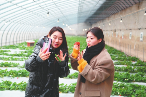 1月16日,江蘇省崗埠農(nóng)場(chǎng)富民農(nóng)業(yè)科技園溫室大棚內(nèi),工作人員正在抖音直播平臺(tái)向消費(fèi)者推介園區(qū)的果蔬、花卉產(chǎn)品。通過(guò)開(kāi)辟線上銷售“新賽道”,讓手機(jī)成為新“農(nóng)具”,讓直播間成為新“柜臺(tái)”,拓寬農(nóng)產(chǎn)品銷售渠道,帶動(dòng)全場(chǎng)溫室大棚種植戶增收。
