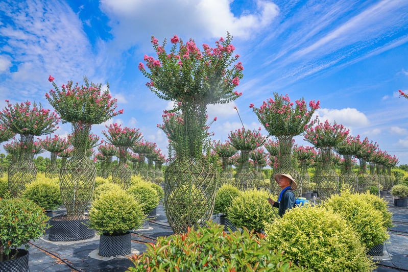 8月14日,在江蘇省鹽城市射陽縣,江蘇農(nóng)墾新洋農(nóng)場容器苗項(xiàng)目基地,管理人員正在養(yǎng)護(hù)紫薇花瓶。近年來,新洋農(nóng)場利用容器苗基地優(yōu)勢,在栽培方式上大膽嘗試,通過扦插培育,實(shí)現(xiàn)了自繁自育栽培技術(shù)的新突破,容器栽培的模式使苗圃成活率更高、綠化效果更好,優(yōu)良的品質(zhì)廣受全國各地綠化項(xiàng)目方的青睞。