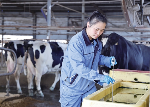 冬季低溫易引發(fā)肺炎威脅奶牛健康。春節(jié)期間,江蘇農(nóng)墾東辛農(nóng)場(chǎng)獸醫(yī)組技術(shù)人員實(shí)行24小時(shí)值守,密切關(guān)注牛只咳嗽、呼吸急促等疑似肺炎癥狀,及時(shí)采取隔離觀察和治療措施,全方位為奶牛健康服務(wù)。圖為技術(shù)人員檢查奶牛健康狀況。 劉興 攝