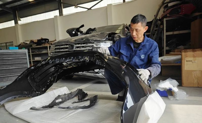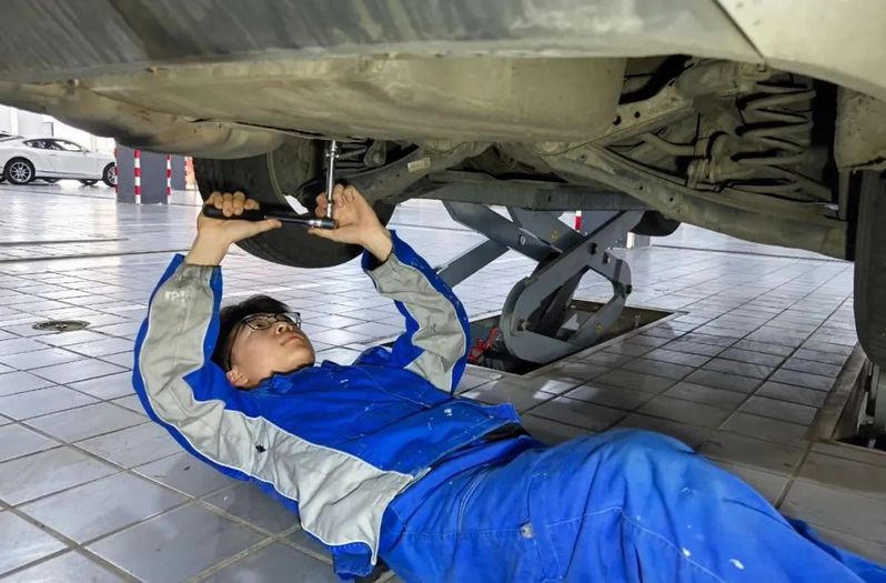 蘇舜元吉公司(上汽大眾4S店)鈑金技師胡同浩斜躺在地上,正在拆卸一輛凌渡車損壞的零件,汗水順著他的額頭流下,他的眼神專注而堅(jiān)定,雙手始終沒有停歇,確保該車輛維修項(xiàng)目快速、有序進(jìn)行。