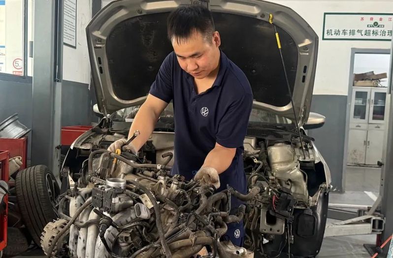 蘇舜金江公司(上汽大眾4S店)機(jī)電技師錢平崗正拆解一輛帕薩特車的發(fā)動機(jī),他說:“客戶著急用車,這個假期就不休息了,要盡快把車修好。”
