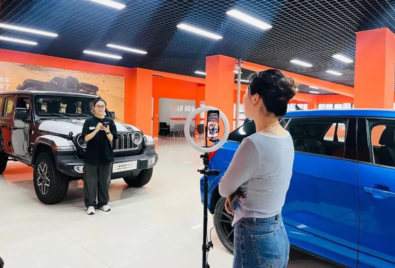 “牧馬人原廠配備全地形255 75/R18輪胎、中控觸摸屏由8寸升級到12寸、涉水深度達(dá)760mm。”蘇舜錦尚公司(Jeep4S店)主播陳佳琪正通過直播間為客戶360°全方位展示和講解車輛配置,她耐心地解答客戶問題,1名客戶已成功預(yù)約進(jìn)店。