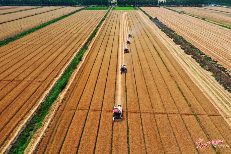 2025年6月4日,江蘇省連云港市海州區(qū)的江蘇農(nóng)墾崗埠農(nóng)場利用晴好天氣搶收成熟的小麥,現(xiàn)場五臺收割機一字排開,馳騁在金色的小麥田里,田間地頭一片繁忙豐收景象。(徐衛(wèi)攝)