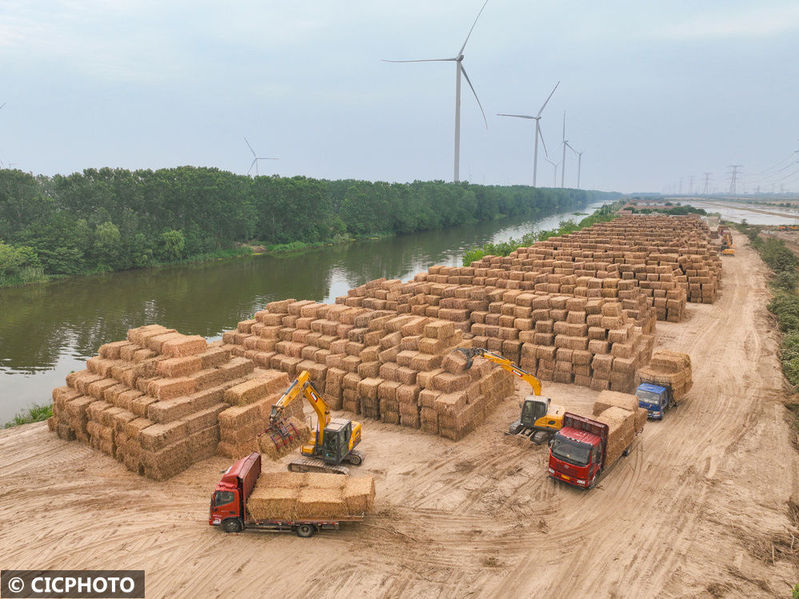 ↑2025年6月7日,在位于江蘇省鹽城市射陽縣的江蘇農(nóng)墾新洋農(nóng)場秸稈回收中心,農(nóng)民駕駛機械整理回收的小麥秸稈。(無人機照片)CICPHOTO/張偉生 攝
